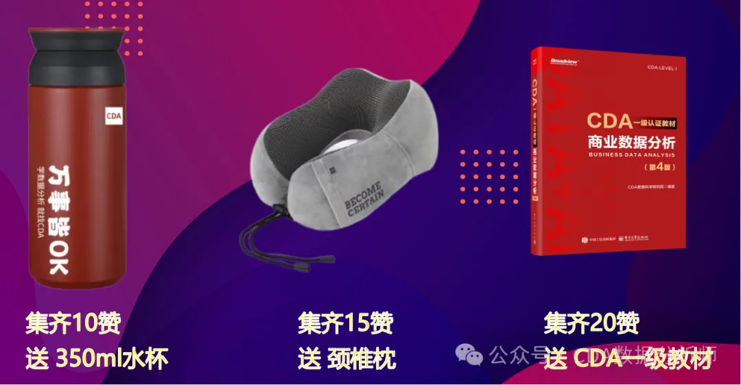 不用拼运气抽奖,不用复杂操作,只要转发CDA真题海报到朋友圈集赞,就能免费抱走实用好礼——CDA定制水杯、护颈颈椎枕、CDA一级核心教材,门槛超低,福利直给不套路!