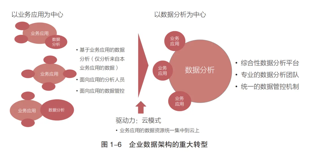 核心是云模式驱动下,企业数据架构从 “以业务应用为中心” 转向 “以数据分析为中心” ,解决传统架构的数据孤岛等问题: