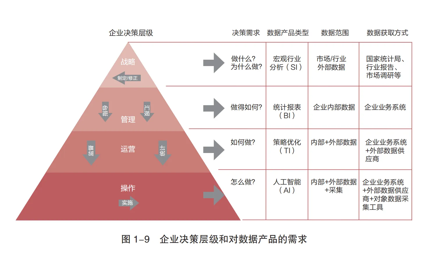 基于感知型企业模型,数据应用能力分为三个阶段;同时,企业不同决策层级(战略、管理、运营、操作)因决策目标差异,对应着差异化的数据需求与数据产品类型。