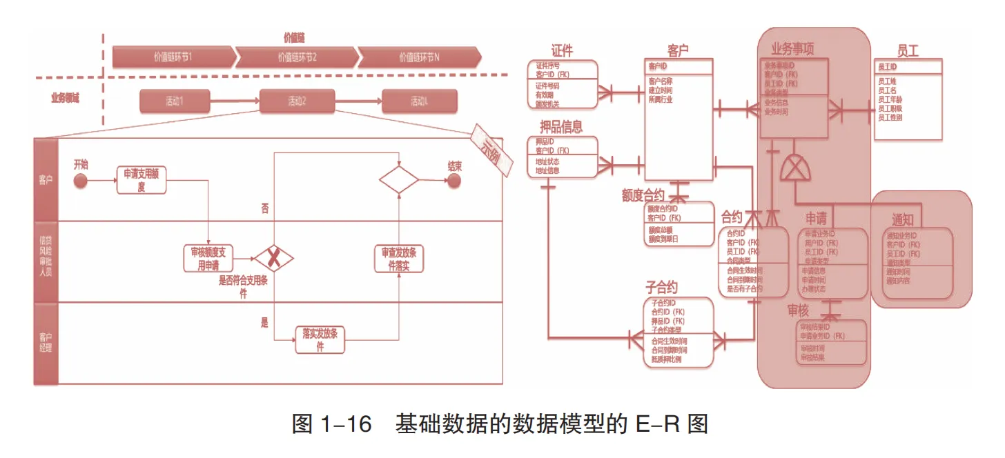 基础数据模型:关系模型(以E-R图呈现),描述业务实体(如客户、合同)及关系,通过主外键关联数据