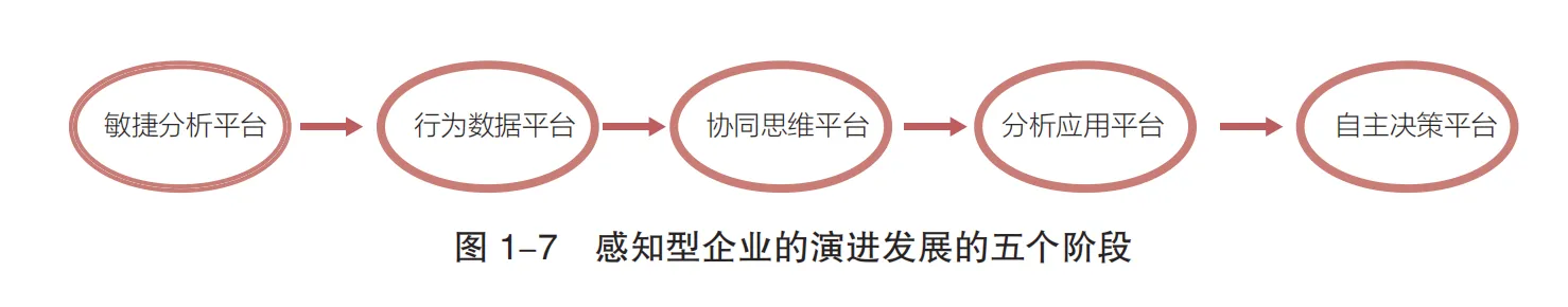 核心是Teradata提出的“感知型企业”(可感知环境并自动化决策),其演进分为五个阶段: