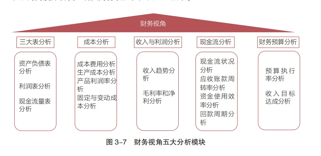 财务视角的五大分析模块构成完整的财务分析框架,覆盖企业财务状况的全维度评估,为财务决策提供数据支撑。通过“趋势+构成”的组合分析,定位营收波动的核心原因,适配营收达标、增长动力挖掘类场景。